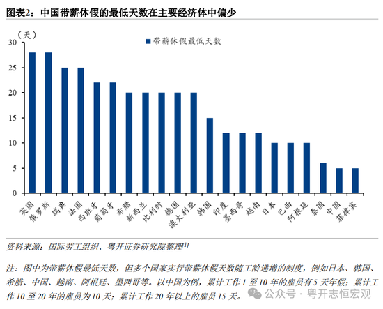 我国劳动者依法享有5到15天带薪年假,平均年假为10天,与主要经济体比存在较大差距。根据《职工带薪年休假条例》,劳动者累计工作已满1年不满10年的,年休假5天;已满10年不满20年的,年休假10天;已满20年的,年休假15天。相比之下,法国、德国、意大利等欧盟国家法定年假通常为20-30天,如法国25天、德国20天。美国虽然没有联邦法律强制规定带薪年假,但多数企业提供10-15天年假。即便跟发展中国家相比,我国劳动者享有的带薪年假也偏少。例如墨西哥的带薪年假也遵循按工龄递增机制,工作满1年即可享受12天带薪年假,满5年可达20天;巴西带薪年假为10-22天;俄罗斯带薪年假至少28天。在我们统计的21个国家中,我国带薪休假最低天数排名靠后。