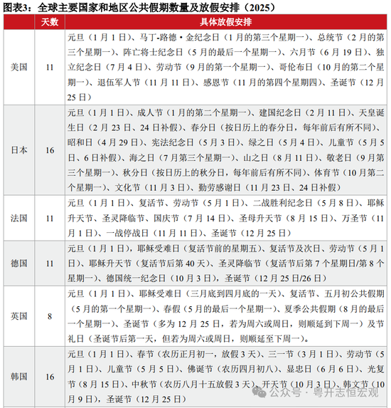 我国公共假期数量达标但“旱涝不均”,上半年假期扎堆、下半年假期较少,分布结构欠佳。2025年,我国公共假期天数增加至13天,略高于美国(11天)、法国(11天),低于韩国(16天)、日本(16天)。但我国公共假期主要集中在上半年(9天),下半年数量偏少(4天)。如7-8月、11-12月没有公共假期,尤其是国庆节后的第四季度不再有公共假期,劳动者除了双休日外没有时间可用于休闲出游。此外,调休后的持续工作导致劳动者身心俱疲,削弱了假期获得感,“假期天数不输人,调休凑假累垮人”的感受普遍存在。
