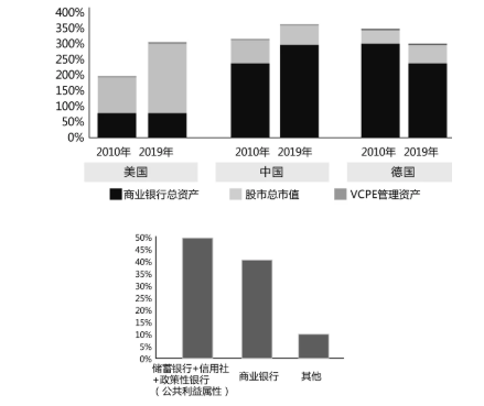 从其他国家的经验看,比较美国和德国,后者的银行体系具有更强的政策性金融属性。就金融资产结构而言,德国的银行资产比例高,美国则是股市比例高(见图2,上图)。一般认为,美国创新能力比德国强,但德国的银行在服务公共利益方面做得比美国好。关键不在于银行业的规模,而是其业务导向,在德国为公共利益服务而不是以商业盈利为第一目标的机构包括储蓄银行、信用社和政策性银行,这三类银行的总资产差不多占到德国银行业的一半(见图2,下图)。