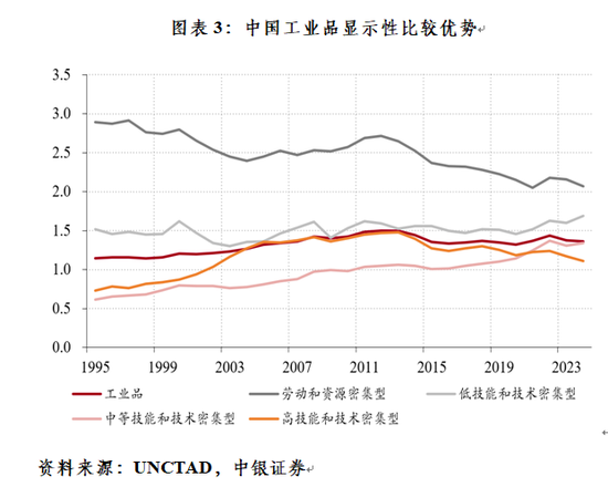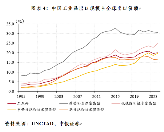 中国商品竞争力提升是中国出口保持韧性、在全球市场份额稳中有升的重要原因。2024年,中国工业品出口占全球出口比重为20.0%,较2018年上升了2.5个百分点。分类型来看,得益于低技能和技术密集型工业品、中等技能和技术密集型工业品比较优势提升,两类工业品在全球出口份额升幅尤其明显,2024年出口份额分别为24.9%、19.8%,均处于历史高位,较2018年分别上升了5.4个、5.9个百分点。同期,虽然劳动和资源密集型工业品RCA指数下降趋势明显,但该类产品在全球出口份额仍然实现了稳中有升,从2018年的29.2%升至2024年的30.5%(见图表4)。这或是因为劳动和资源密集型工业品RCA指数至今仍远大于1,且高于同期技能和技术密集型工业品指数,表明相关产品比较优势仍然突出,增加了海外市场对中国商品的依赖度,进而增强了中国出口抵御关税冲击的能力。