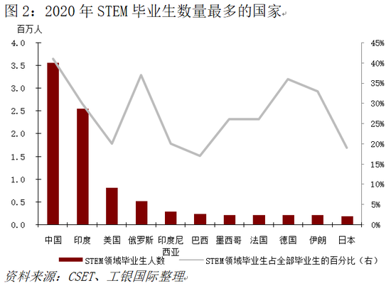 其一是工程师规模优势。根据乔治城大学CSET数据,以2020年为例,中国STEM毕业生数量超过第二、第三位国家毕业生数量之和,形成全球最大的工程师供给体系。更重要的是,中国的工程师与产业链高度结合,具备强大的应用导向和工程能力,从而使技术能够更快地转化为产品、更快地融入产业、更快地在规模化场景中验证并迭代。