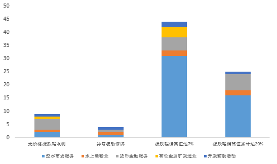 根据2019年沪深300涨跌幅交易异动的行业数据,结果显示,共有4个行业包括资本市场服务、水上运输业、货币金融服务业、开采辅助活动业均发生过无价格涨跌幅限制、异常波动停牌、涨跌幅偏离值达7%以及连续三个交易日偏离值累计达20%四种类型的涨跌幅交易异动。其中涨跌幅偏离值达到7%这类异动的频数最高,为40次,其余依次为连续三个交易日累计涨跌幅偏离值累计达20%(25次)、无价格涨跌幅限制波动(8次)、异常波动停牌(4次)。由此说明资本市场服务业、水上运输业、货币金融服务业、开采辅助活动业的涨跌幅偏离值有比较大的波动,其市场价格受到影响波动的作用更大,体现出该行业的买卖力和活跃度较高,具有较高投资价值且交易无异常波动的行业其更受到投资者的关注,而由于政策等消息面影响会对行业的价格产生短期的偏离影响,利好的政策会产生涨幅偏离值,而利空的政策则会造成跌幅偏离值。