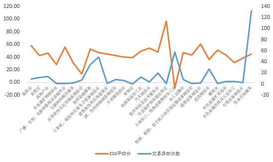 图5. 2019年交易异动次数与ESG平均分行业变化图(单位:分、次)