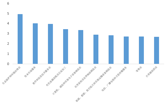 根据2019年沪深300融券余额最低的数据,结果可知,融资余额占流通股比例最高的前十行业依次为生态保护和环境治理业(4.94%)、资本市场服务(4.02%)、软件和信息技术服务业(3.97%)、有色金属冶炼及压延加工(3.43%)、计算机、通信和其他电子设备制造业(3.35%)、化学原料及化学制品制造业(2.90%)、铁路、船舶、航空航天和其他运输设备制造业(2.83%)、电信、广播电视和卫星传输服务(2.73%)、零售业(2.71%)、开采辅助活动(2.69%)。