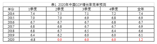 基于此,我们可以做一个简单的预测(如表1所示),2020年中国GDP增长率是多少?《世界经济展望报告》预测2020年GDP增长率为1.2%,基本就是2季度零增长,3、4季度维持2019年的增长率。