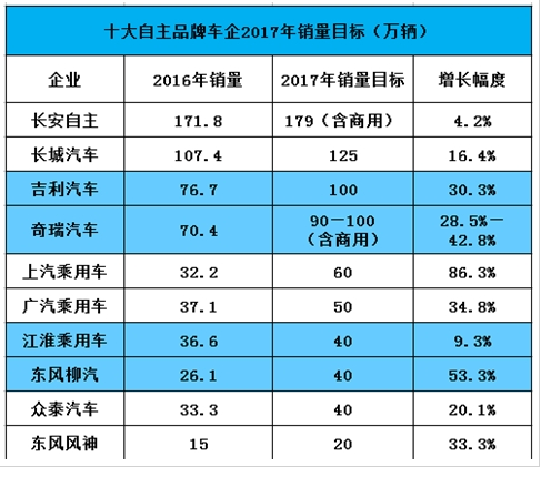 2016年自主品牌乘用车年销量首次突破1000万辆大关,在2016年销量大增的前提之下,各大自主车企纷纷制定了2017年的销量目标,平均增幅在21%左右。从智通财经制作的下表可以看出,吉利汽车的翻身,靠的就是国产自主品牌汽车的大卖。