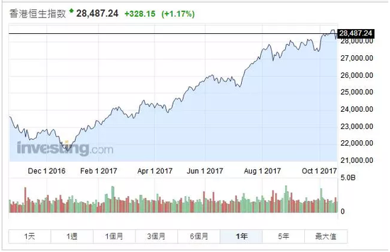 相对大部分新兴市场股市,香港恒指年内走势也十分出色。以年内升幅计算,香港恒生指数跑赢全球多个地方的股市。香港恒指过去多年从来没有像今年这么兴奋,由年初约22000点水平飙升至周五收报28487点,累积涨幅达29.5%,远高于美国三大股指年内录得介乎14.4%至22.7%的升幅。