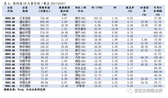 根据港交所披露的港股通持股数据,截止到2017年10月19日,港股通持股总规模达到7,807.42亿港元,持股规模最大的前20只股票的持股市值达4,432.91亿港元,占港股通持股总市值的56.78%。前十分别是汇丰控股、建设银行、工商银行、腾讯控股、融创中国、吉利汽车、招商银行、中国银行、新华保险、中信银行。
