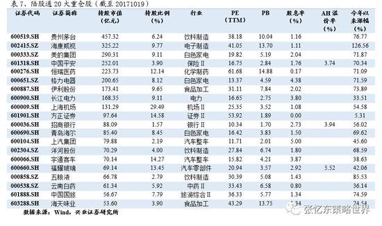 根据陆股通持股数据,截止到2017年10月19日,陆股通持股总规模达到4812.08亿元,持股规模最大的前20只股票的持股市值达3021.25亿元,占陆股通持股总市值的62.78%。前十大分别是贵州茅台、海康威视、美的集团、中国平安、恒瑞医药、格力电器、伊利股份、长江电力、上海机场、方正证券。