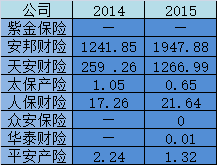 可以看到,2015年,8家公司中,仅安邦财险以及天安财险两家公司的保户储金以及投资款规模就已经超过了3000亿元,占据了绝对的市场份额。其余6家公司中,人保财险是唯一超过10亿元的公司,但2015年仅21.64亿元的收入,相较其当年超2000亿元的保费收入来说,仍旧微乎其微,紫金保险更是已经彻底停售。