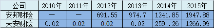 2010-2015年安邦财险以及天安财险的保户储金以及投资款收入情况(单位:亿元)