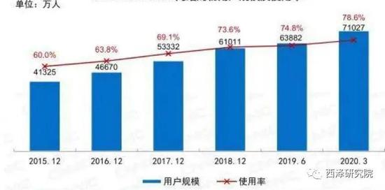 网络购物形式已经存在多年,其营销模式已经逐步成熟,自身拥有一套系统的服务体系。如今,电商直播也是建立在网购的基础上,在客户信任感、物流、网络支付、售后服务等多方面出现的问题已经在网购这么多年的发展中得以解决。其次,如图2-10所示,网络购物用户的规模以及使用率近年来一直在快速增长,截止2020年3月,网络购物用户规模大约为7.1亿,较2018年底增长了16.4%,占网民整体的78.6%。将网购发展过程中积累下来的客户群体引入直播间购物已经使其发展走了很大的捷径。因此基本成熟的网络购物形式以及网络购物用户规模的不断扩大是直播电商得以迅速发展的必要基础。