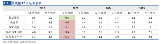 美联储预测大幅下调2023年经济增速,上调通胀水平。在经济预测部分,美联储预期2023年实际GDP增长0.5%,较9月预测的1.2%大幅下调了0.7个百分点。在通胀预测部分,美联储预期2023年PCE同比3.1%,较9月预测的2.8%上调0.3个百分点。但根据我们在《美国经济或将深度衰退——2023年美国经济展望》中的分析,美国经济2023年或将深度衰退,经济增速可能降至-1.5%。在这种衰退幅度下,美国通胀将会快速回落,甚至出现通缩风险。