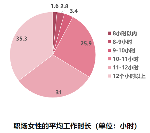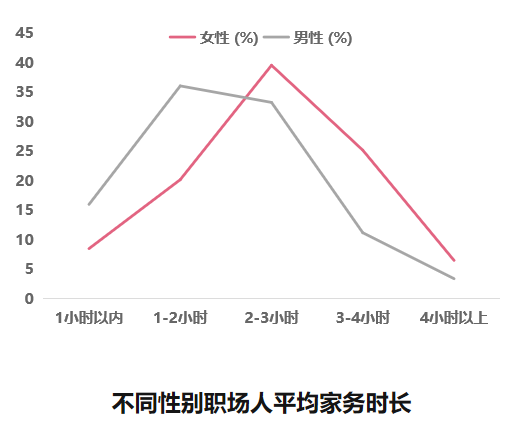 职场女性不仅需要面对高强度的工作,还要承担家务劳动。数据显示,38.8%以上的女性日均工作时长超过9小时,90%以上的女性平均的家务时间超过1小时;而男性在家务劳动上的时间投入相对较少,尤其是在家务时长2-3小时这个区间,女性的参与度明显高于男性[1]。