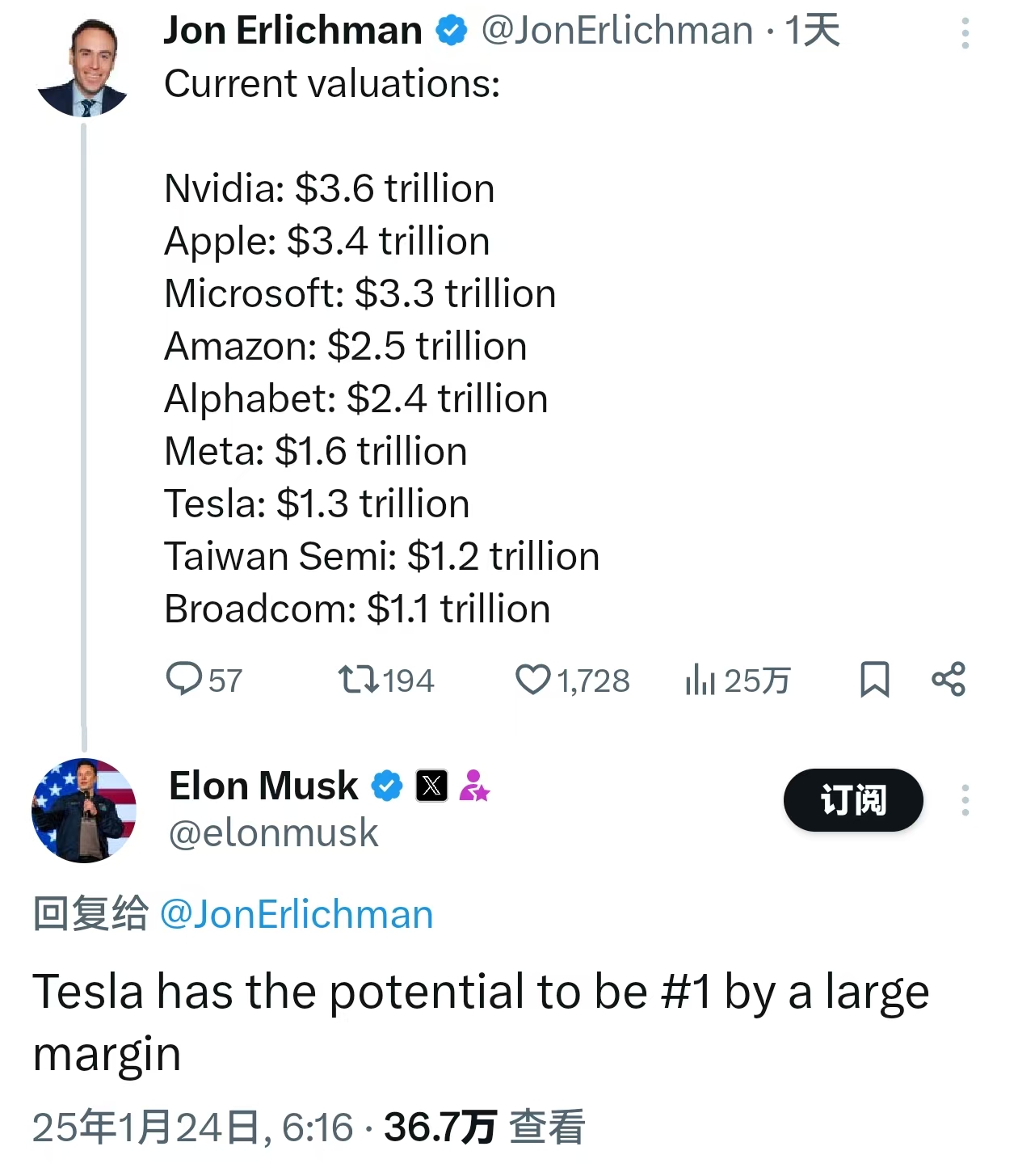 特斯拉首席执行官埃隆·马斯克昨日在X平台回复网友,认为特斯拉公司市值有望突破4万亿美元(约合29万亿元),成为全球市值最高的公司,并遥遥领先。当地时间周五收盘,特斯拉市值为1.31万亿美元,位列第7;特斯拉股价2025年涨幅为7.2%,过去1年涨幅为95.63%。