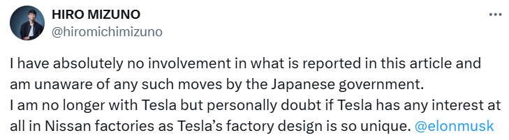 2月21日,特斯拉前董事水野弘道在社交媒体平台X发文,否认其在“日本财团起草特斯拉投资日产汽车的计划”有关联,“我也不知道日本政府有任何此类举动”。此前有市场消息称,知情人士透露,日本高层小组计划与马斯克接洽,邀请特斯拉投资日产。报道称,由水野弘道领导的这项新提案得到了日本前首相菅义伟的支持。