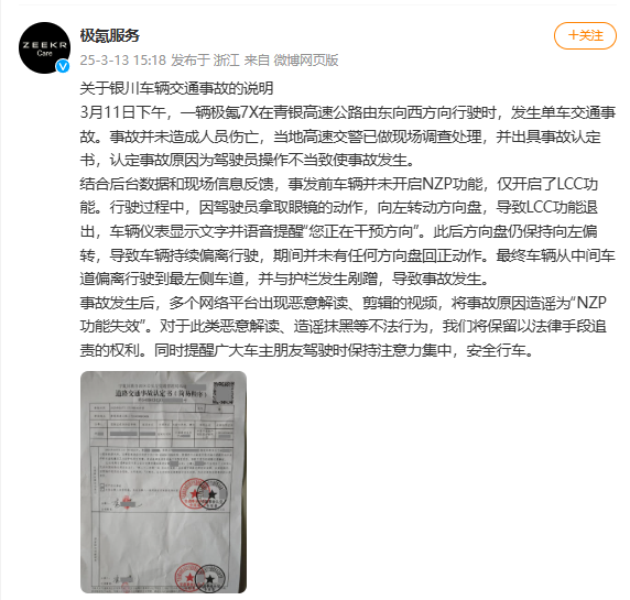 极氪服务官博发文称,3月11日下午,一辆极氪7X在青银高速公路由东向西方向行驶时,发生单车交通事故。事故并未造成人员伤亡,当地高速交警已做现场调查处理,并出具事故认定书,认定事故原因为驾驶员操作不当致使事故发生。