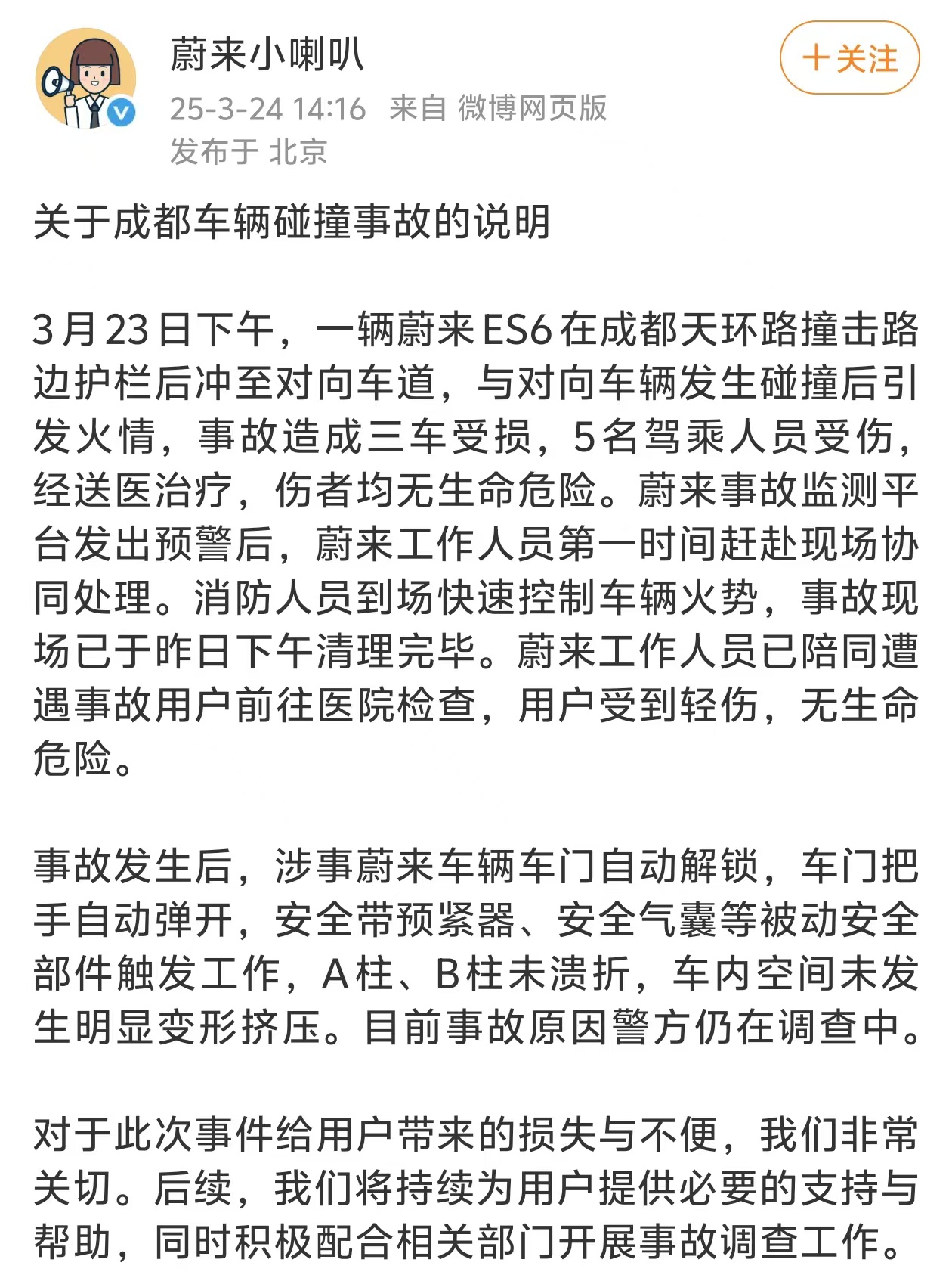 今日,蔚来发布成都车辆碰撞事故的说明。蔚来表示3月23日下午,一辆蔚来ES6在成都天环路撞击路边护栏后冲至对向车道,与对向车辆发生碰撞后引发火情,事故造成三车受损,5名驾乘人员受伤,经送医治疗,伤者均无生命危险。蔚来事故监测平台发出预警后,蔚来工作人员第一时间赶赴现场协同处理。消防人员到场快速控制车辆火势,事故现场已于昨日下午清理完毕。蔚来工作人员已陪同遭遇事故用户前往医院检查,用户受到轻伤,无生命危险。事故发生后,涉事蔚来车辆车门自动解锁,车门把手自动弹开,安全带预紧器、安全气囊等被动安全部件触发工作,A柱、B柱未溃折,车内空间未发生明显变形挤压。目前事故原因警方仍在调查中。(新浪科技)
