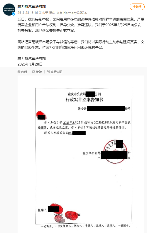 今日,“赛力斯汽车法务部”官微发文称:某网络用户多次编造并传播针对问界车辆的虚假信息,严重侵害企业和用户合法权利,误导公众,涉嫌违法。赛力斯汽车法务部表示,已于2025年3月25日向公安机关报案,现已获公安机关正式立案。