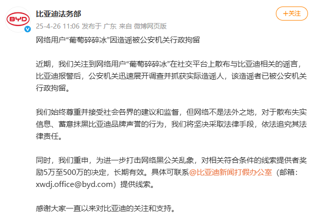 4月26日,据比亚迪法务部,网络用户“葡萄碎碎冰”因造谣被公安机关行政拘留。近期,比亚迪法务部关注到网络用户“葡萄碎碎冰”在社交平台上散布与比亚迪相关的谣言,比亚迪报警后,公安机关迅速展开调查并抓获实际造谣人,该造谣者已被公安机关行政拘留。