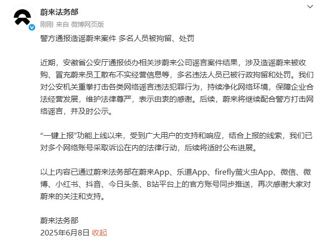 8日,蔚来法务部发文称:近期,安徽省公安厅通报侦办相关涉蔚来公司谣言案件结果,涉及造谣蔚来被收购、冒充蔚来员工散布不实经营信息等,多名违法人员已被行政拘留和处罚。我们对公安机关重拳打击各类网络谣言违法犯罪行为,持续净化网络环境,保障企业合法经营发展,维护法律尊严,表示由衷的感谢。后续,蔚来将继续配合警方打击网络谣言,并及时公示。