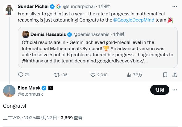 有帖文称“Gemini在国际数学奥林匹克竞赛中达到了金牌水平!一个高级版本能够解决6道题中的5道。”另有博主表示,“仅仅一年时间,从银牌到金牌——(其)数学推理方面的进步速度简直令人惊叹!”埃隆·马斯克转发并表示:“恭喜!”