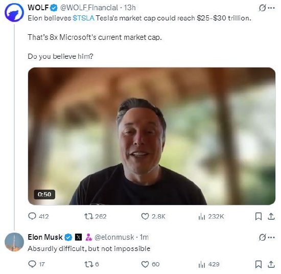 一位X用户转发马斯克此前一段讲话的视频,称特斯拉市值未来可能达到25万亿到30万亿美元。该用户写道:“这是微软目前市值的8倍。你相信他吗?”马斯克回应称:“困难至极,但并非不可能。”今年7月,马斯克在线出席一场特斯拉粉丝活动时表示,如果特斯拉能够在“擎天柱”人形机器人和自动驾驶领域成功执行其宏伟蓝图,公司的估值有望达到25万亿至30万亿美元,这一数字是其当前市值的20到30倍。