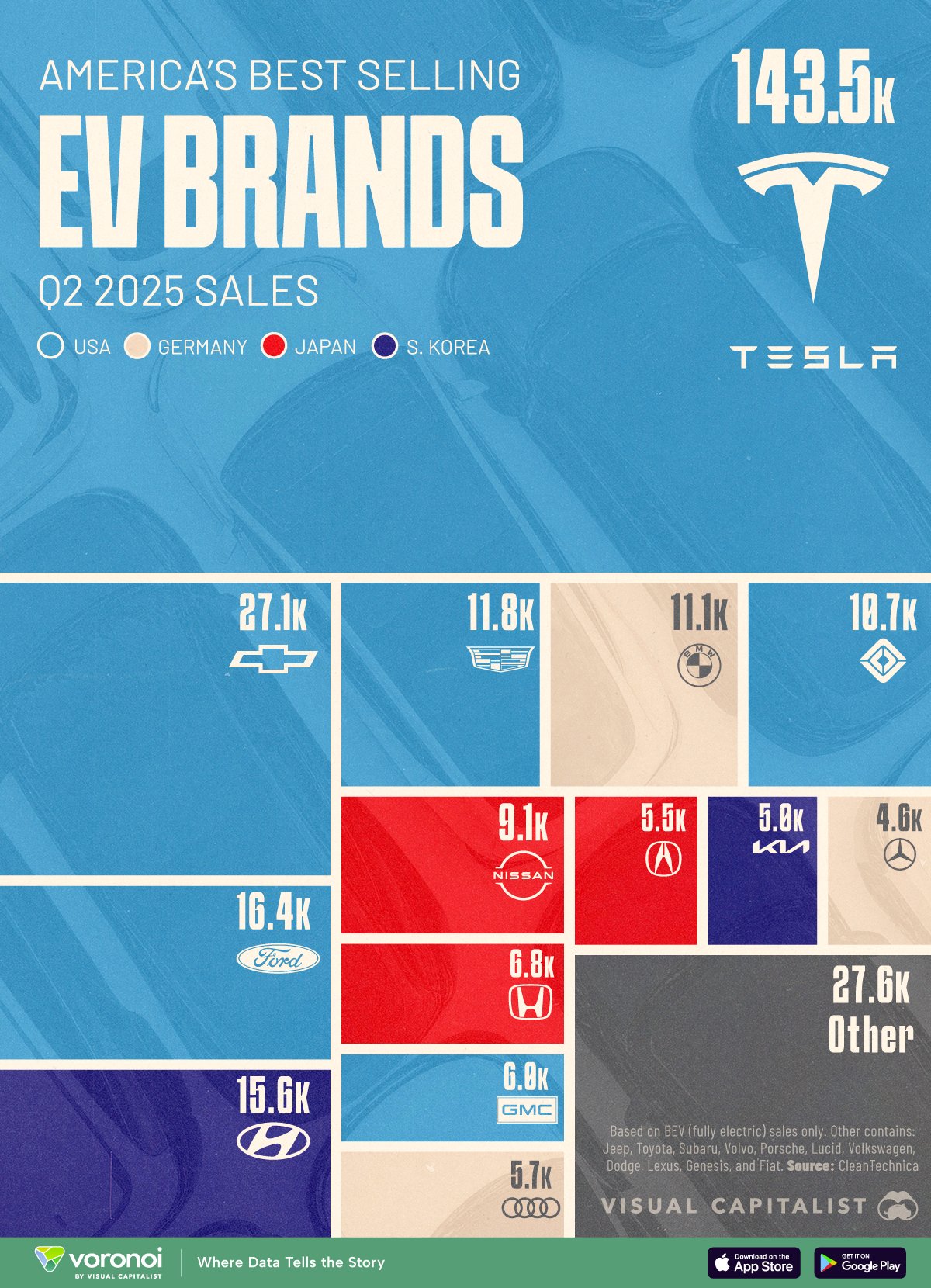 2025年第二季度,特斯拉继续在美国电动汽车市场占据主导地位,市场份额达48.5%,交付量达14.35万辆。虽然交付量与前几个季度相比略有下降,仍远远领先于其他竞争对手。雪佛兰以2.71万辆的销量位居第二,加上凯迪拉克和GMC,通用汽车的市场份额将达到15.2%,高于上一季度的10.8%。福特和现代势均力敌,上季销量分别为1.64万和1.56万辆,各自占据5.5%和5.3%的市场份额。