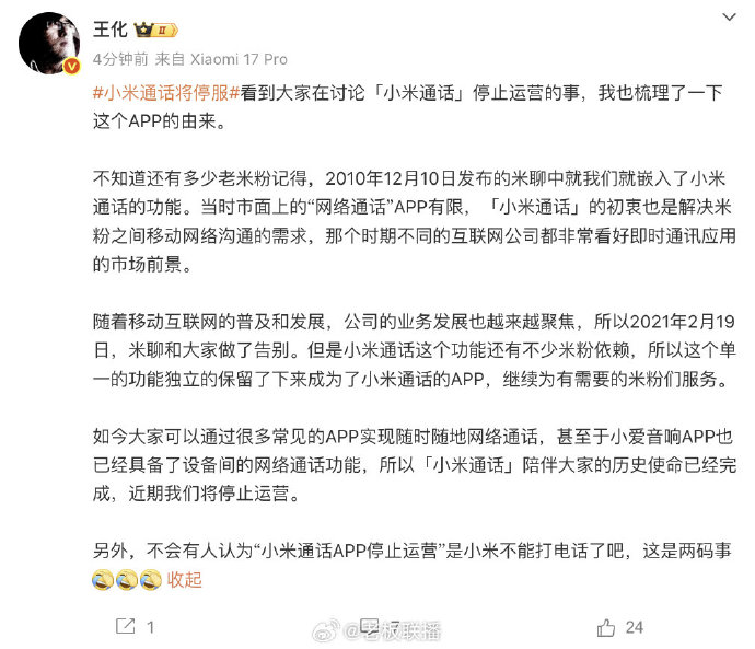 11月6日,王化发文回应小米通话将停服 :看到大家在讨论「小米通话」停止运营的事,我也梳理了一下这个APP的由来。 不知道还有多少老米粉记得,2010年12月10日发布的米聊中就我们就嵌入了小米通话的功能。当时市面上的“网络通话”APP有限,「小米通话」的初衷也是解决米粉之间移动网络沟通的需求,那个时期不同的互联网公司都非常看好即时通讯应用的市场前景。 随着移动互联网的普及和发展,公司的业务发展也越来越聚焦,所以2021年2月19日,米聊和大家做了告别。但是小米通话这个功能还有不少米粉依赖,所以这个单一的功能独立的保留了下来成为了小米通话的APP,继续为有需要的米粉们服务。 如今大家可以通过很多常见的APP实现随时随地网络通话,甚至于小爱音响APP也已经具备了设备间的网络通话功能,所以「小米通话」陪伴大家的历史使命已经完成,近期我们将停止运营。 另外,不会有人认为“小米通话APP停止运营”是小米不能打电话了吧,这是两码事。