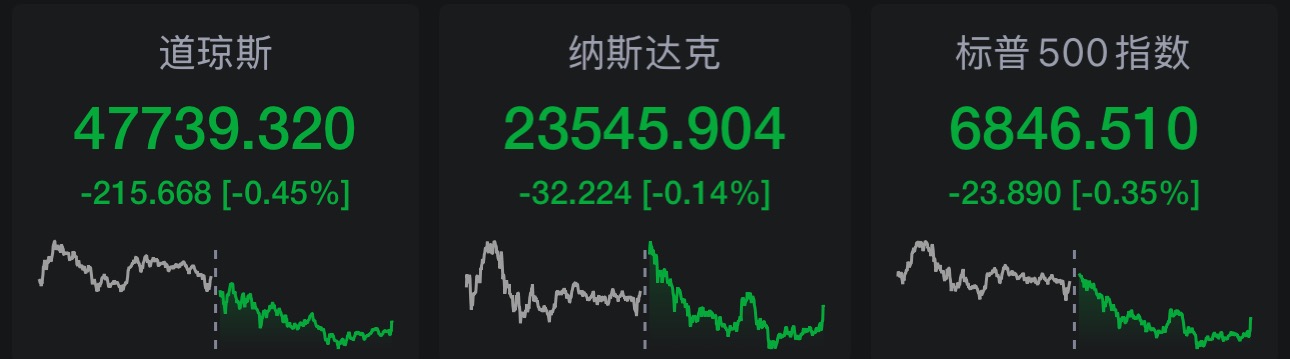 周一美股三大指数收跌,道指跌0.45%,纳指跌0.14%,标普500指数跌0.35%。大型科技股涨跌不一,博通涨超2%,英伟达、微软、甲骨文、AMD涨超1%。特斯拉、奈飞跌超3%,谷歌、英特尔跌超2%,亚马逊跌超1%,Meta跌约1%,苹果小幅收跌。