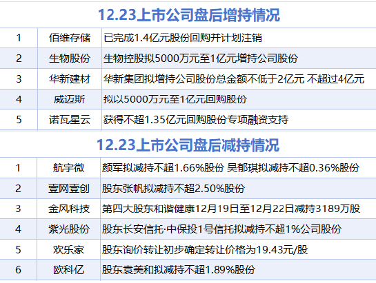 据统计,12月23日,盘后佰维存储、生物股份、华新建材、威迈斯、诺瓦星云披露增持情况。包括航宇微、壹网壹创、金风科技、紫光股份、欧科亿、欢乐家在内的6家A股上市公司披露减持情况。