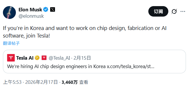 特斯拉CEO埃隆·马斯克转发Tesla AI的公告,该公告称公司正在韩国招聘人工智能芯片设计工程师。马斯克表示:“如果你身处韩国,并且想要从事芯片设计、制造或人工智能软件相关的工作,那就加入特斯拉吧。”
