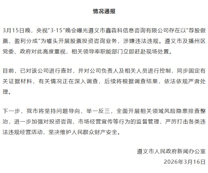 遵义市人民政府新闻办公室3月16日凌晨就荐股分成骗局发布情况通报。3月15日晚,央视“3·15”晚会曝光遵义市鑫犇科信息咨询有限公司存在以“荐股做票、盈利分成”为噱头开展股票投资咨询业务,涉嫌违法违规。遵义市及播州区党委、政府对此高度重视,相关领导率职能部门立即赶赴现场处置。目前,已对该公司进行查封,并对公司负责人及相关人员进行控制,同步固定有关证据材料,有关情况正在深入调查,后续将根据调查结果,依法依规严肃处理。下一步,我市将坚持问题导向,举一反三,全面开展相关领域风险隐患排查整治,进一步加强对投资咨询、市场经营宣传等行为的监督管理,严厉打击各类违法违规经营活动,坚决维护人民群众财产安全。