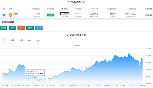 比特币又疯了!24小时内,最高一度涨到了57369美元/枚,距离两周前的历史最高点仅1000多美元。此后,比特币陷入短期深度调整,一度跌回56000美元下方,然后极速拉升,截至发稿,比特币报56538美元/枚,24小时涨幅超4%。