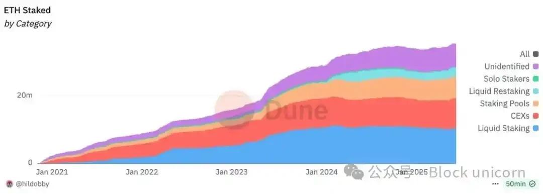 价格表现平平,但以太坊的质押指标却体现了变化。质押的 ETH 数量刚刚创下历史新高,超过 3500 万枚,几乎占总流通供应量的 30%。尽管这些基础设施建设已持续数月,但现在突然变得尤为重要。