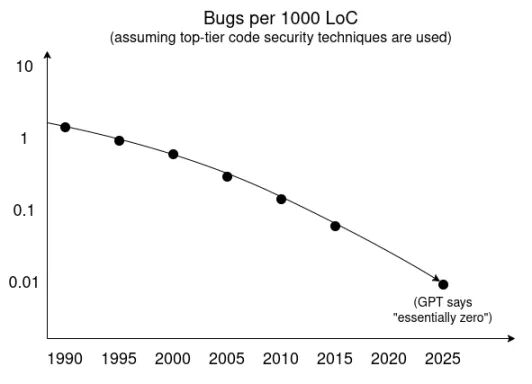 一种理解方式是采用 AI 研究人员最喜欢的技术:趋势外推。以下是基于 GPT 深度研究调查的趋势线,假设采用顶级安全技术,每千行代码的漏洞率随时间变化如下。