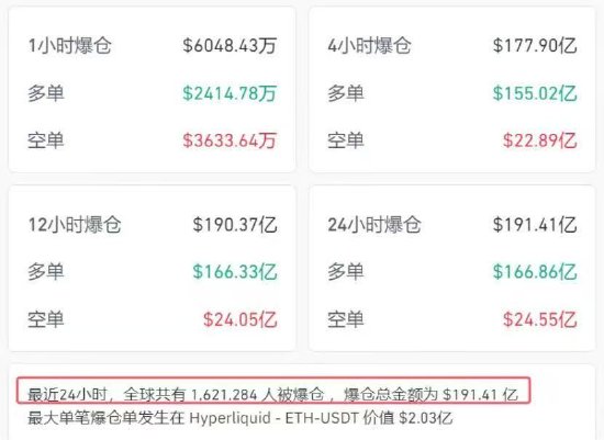 根据Coinglass公开的数据,此次雪崩式下跌,引发全网超162万人爆仓,合约爆仓金额超190亿美元。