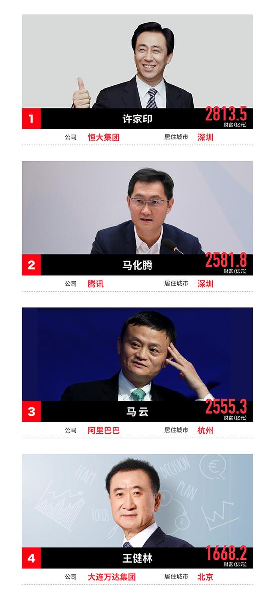 | 1 | 许家印 | 2813.5 | 恒大集团 | 深圳 |
