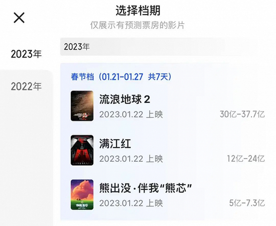 公开信息显示,已有《流浪地球2》《满江红》《熊出没·伴我“熊芯”》《无名》与《深海》5部电影陆续定档。其中,前三部影片,业内给出的预测票房分别为30-37.7亿元、12-24亿元和5-7.3亿元,预期票房之和达60亿元左右,与2022年春节档最终票房相当。
