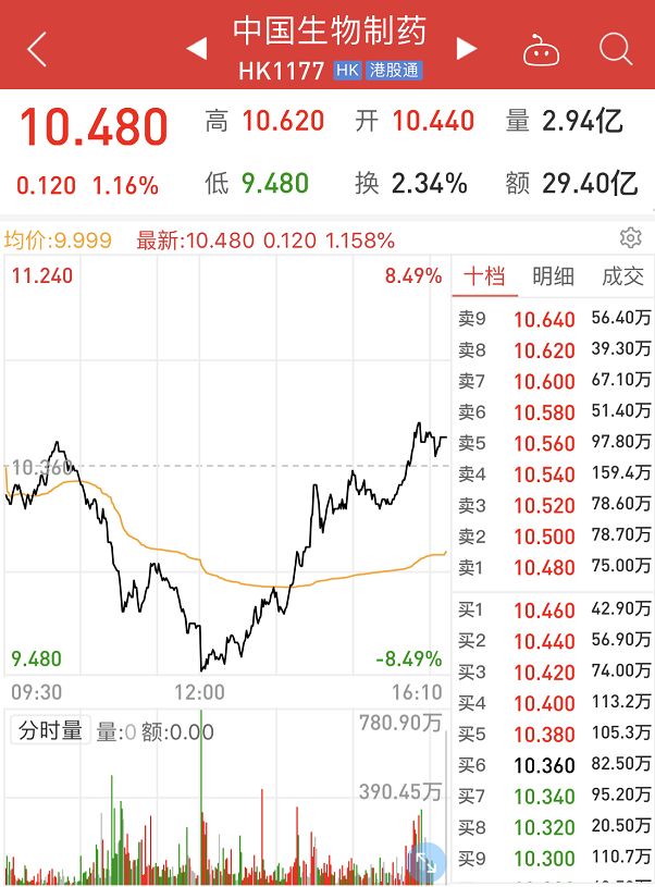 盘中一度杀跌8.2%的港股中国生物制药尾盘也顽强收红。