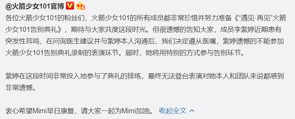 李紫婷因病缺席告别典礼尽管依靠腾讯的强势,火箭少女101从出道至解散仍然保持了11人完整体,但昨晚的告别典礼却只有10个人,两天前,组合官博告知观众成员李紫婷因突发性耳鸣将缺席告别典礼,在这之前李紫婷便发布了正在输液的照片。成员忽然病倒缺席告别典礼也招致了粉丝不满,对组合运营公司哇唧唧哇和背后的腾讯“血汗工厂”的指控占据了火箭少女饭圈的主流声音。尤其是临近解散还被指派参加同公司师弟团r1se参与的《炙热的我们》,更让粉丝们质疑公司压榨火箭少女以扶持r1se。