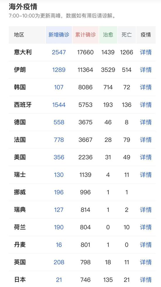 海外确诊总人数已经到了65380人,和昨天相比增加了7千多人。各国数据读上表,我就不再赘述了。鉴于美国等一些国家还没有开展全面检测,实际感染人数应该远远大于现在的人数。特朗普已经宣布美国进入紧急状态,并且拨款500亿美元来对抗疫情,将开始通过最方便的手段,免费为全民进行病毒检测。终南山说,美国现在的新冠肺炎病死率是将近3%,这么高,一定是说明有很多病人还没被发现。