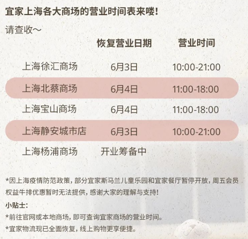 据悉,宜家上海杨浦商场将持续营业至7月初。6月10日至7月6日,宜家杨浦商场将提供会员专享活动,包括数百款商品低至5折起与会员双倍积分。7月6日之后,杨浦及周边消费者仍然可以从上海的其他宜家线下商场以及电商平台获得家居灵感和解决方案。宜家为上海消费者创造更美好的日常生活的承诺不会改变。