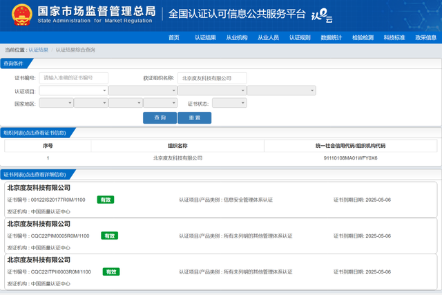 通过百度网盘用户协议可知,目前百度网盘运营方为北京度友科技有限公司。红星资本局查询全国认证认可信息公示平台发现,该公司确实取得了三项安全认证证书,证书到期时间为2025年5月。