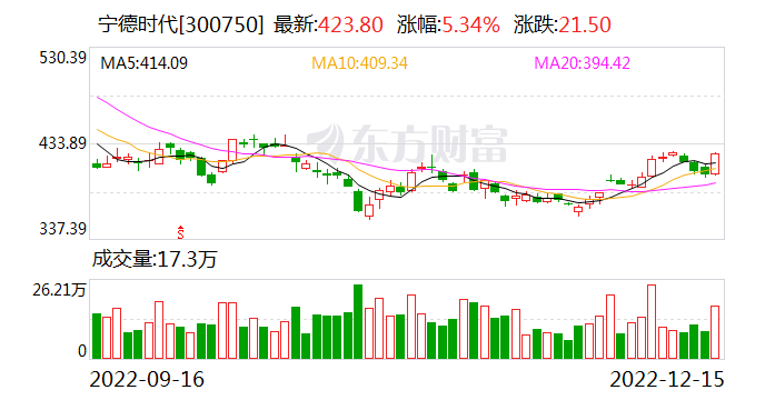 受此消息影响,12月15日,宁德时代报收于423.8元/股,涨幅为5.34%。
