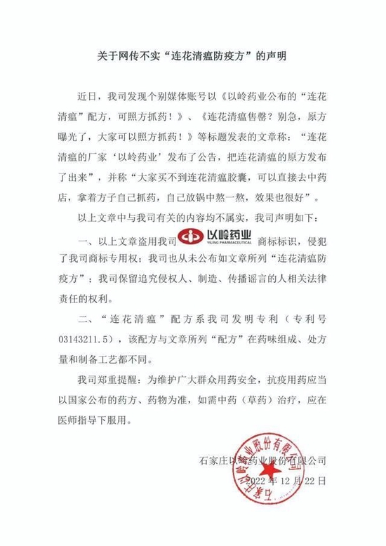 12月22日,石家庄以岭药业在微信公众号发布声明称:以上文章中与公司有关的内容均不属实,公司从未公布如文章所列“连花清瘟防疫方”;保留追究侵权人、制造、传播谣言的人相关法律责任的权利。“连花清瘟”配方系公司发明专利(专利号03143211.5),该配方与文章所列“配方”在药味组成、处方量和制备工艺都不同。