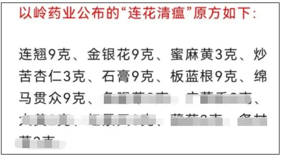 12月22日,近日,微信公众号等平台流传多篇《以岭药业公布的“连花清瘟”配方,可照方抓药!》《连花清瘟售罄?别急,原方曝光了,大家可以照方抓药!》等相关文章。其中提到:“连花清瘟的厂家‘以岭药业’发布了公告,把连花清瘟的原方发布了出来”,并称“大家买不到连花清瘟胶囊,可以直接去中药店,拿着方子自己抓药,自己放锅中熬一熬,效果也很好”。
