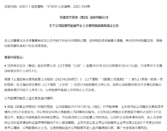 3月2日晚间,*ST荣华公告,公司股票已连续20个交易日(2023年2月3日-3月2日)收盘价格均低于1元,已触及《股票上市规则》9.2.1条第一款规定的交易类退市指标。根据《股票上市规则》的相关规定,公司股票自3月3日开市起停牌,上交所将在公司触及交易类退市情形之后5个交易日内,向公司发出拟终止其股票上市的事先告知书。