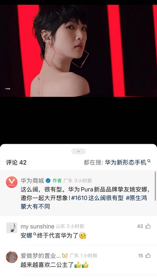 此外就在最近,华为官宣姚安娜成为华为Pura新品品牌挚友,这也是姚安娜首次代言自家品牌。