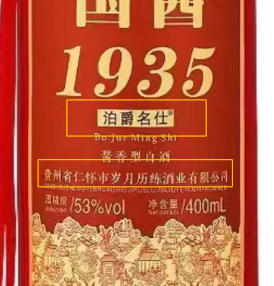 从图中可以看出,这款酒名为“国酱1935”,当然这是酒的主品牌。在酒瓶的包装上,还有几个小字——泊爵名仕,图案中,泊爵名仕几个字后面的“R”显示,泊爵名仕才是这款酒的商标。